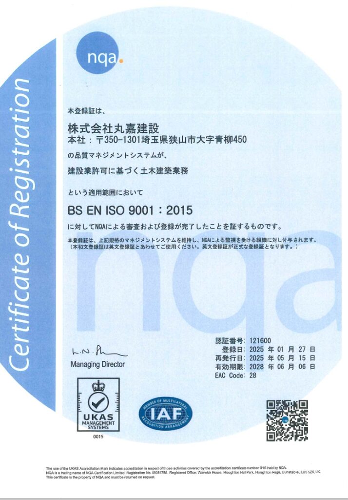 埼玉県狭山市を基盤とした株式会社丸嘉建設は、小規模工事から大規模工事、公共工事、民間工事、個人様まで、幅広くお客様のニーズに応えるべく前進してまいりました。地元企業特有の施工対応能力は、官公庁、民間企業、個人様より、高く評価され信頼されております。ものつくりにかける会社の信念と技術者としての熱い情熱 人々との大切なつながり、絶対に事故はおこさないと思う人間愛、これからも将来に向かって 皆様方のために前進してまいります。